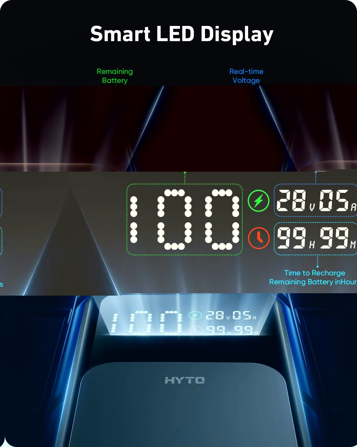 - LED-skjerm som viser nøyaktig batterinivå og ladeeffekt