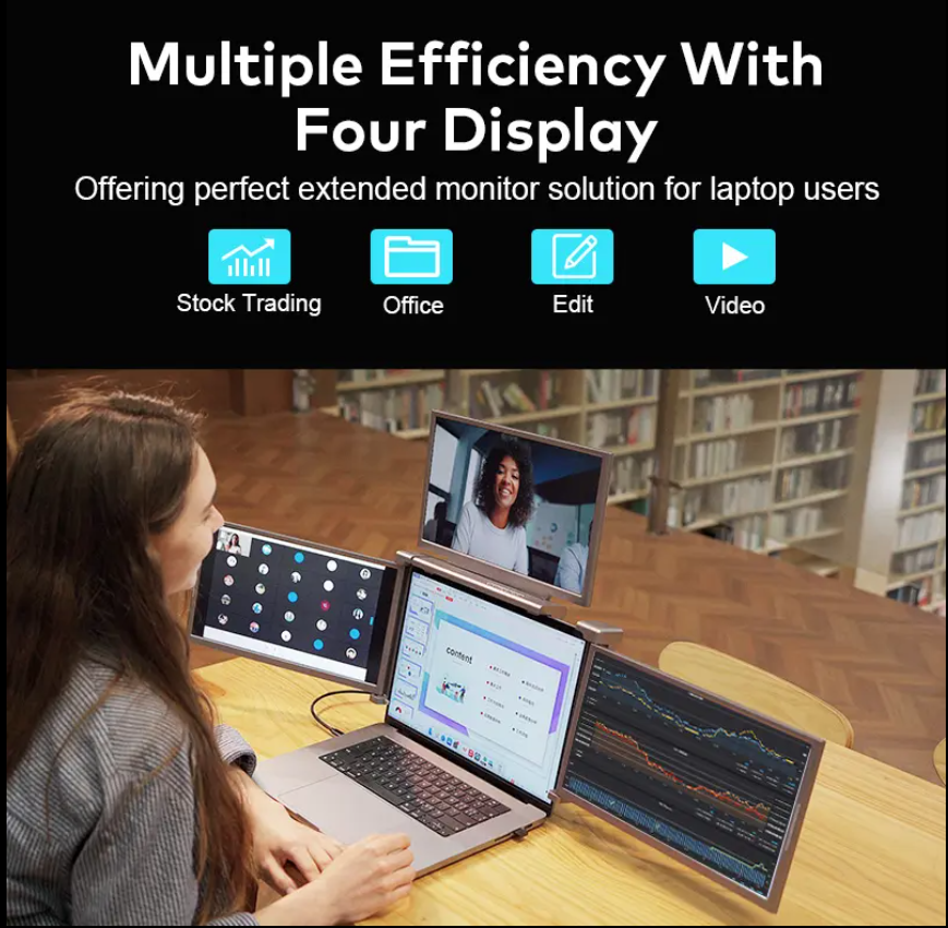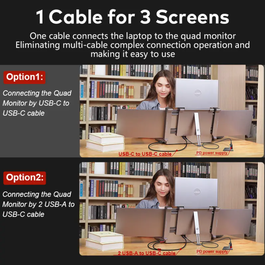 Ønsker du mer plass til oppgavene dine uten å måtte sette opp et helt kontor? Med vår quad skjerm-extender med skjermfeste får du her tre ekstra skjermer til laptopen din – alt koblet til med kun én USB-C-kabel. (nettadapter behov for å levere nok strøm til den 3 monitoren)